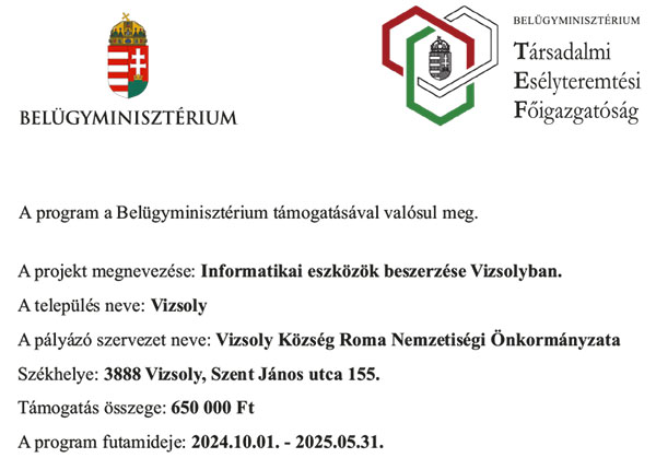 A Vizsoly Község Roma Nemzetiségi Önkormányzata (székhely: 3888 Vizsoly, Szent János utca 155.; adószám: 15797216-1-05) által a Belügyminisztérium megbízásából a Társadalmi Esélyteremtési Főigazgatóság által a „Roma nemzetiségi önkormányzatok informatikai infrastruktúrájának fejlesztésére” meghirdetett nyílt pályázati felhívásra benyújtott, RNÖ-FEJL-24-0142 pályázati azonosítón nyilvántartásba vett pályázati projekt támogatásban részesült.